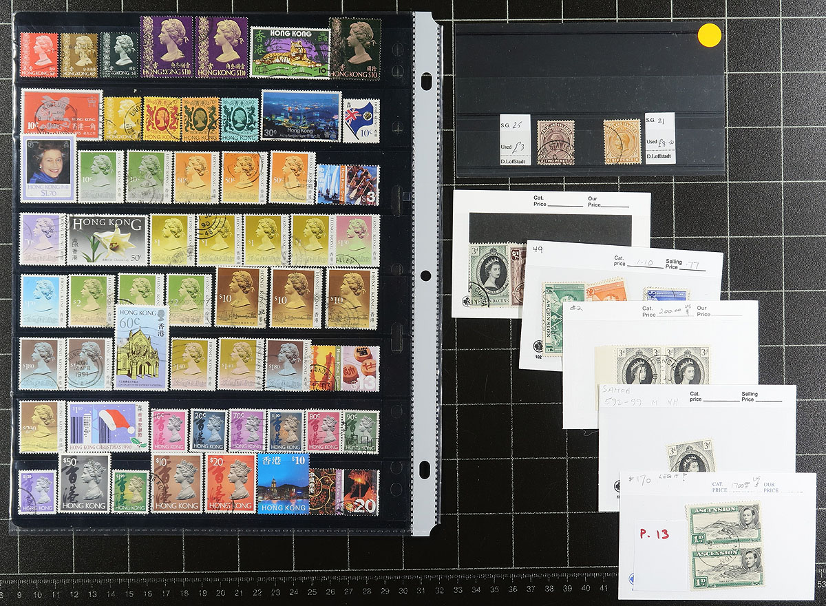 Used selection from several colonies, including a few where used is more difficult to find than mint. Strength is in British South Atlantic with Ascension (#13 x2, 1948 Silver Wedding high value), Falklands (#34, #100), St. Helena, Tristan da Cunha. From the same area is a page of St. Lucia (a bit of mint mixed in here) and then two pages with a century of Hong Kong issues (catalogues $225.00). A very nice selection, perfect to fill in spaces or to break up for sale. Estimate =