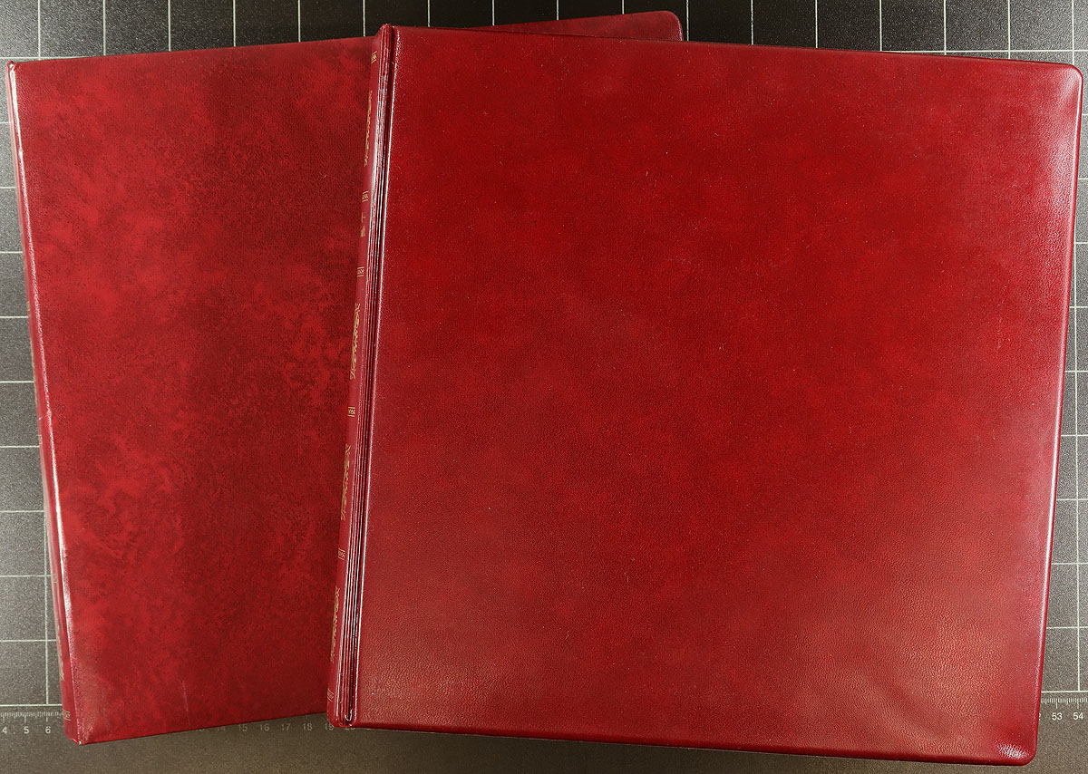 1974 World Cup "Borek" album pair in specialty 6-ring binder with hingeless pages. The first volume has 107 mint, never hinged, stamps, 20 souvenir sheets and a cover - apparently complete for the participating countries. The second is a group of 47 different German covers cancelled at the various stadiums where matches took place, some with added cachets indicating the score of the match. Great condition, not often seen and just in time for the upcoming matches in North America! Estimate =