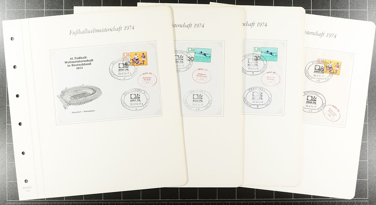 1974 World Cup "Borek" album pair in specialty 6-ring binder with hingeless pages. The first volume has 107 mint, never hinged, stamps, 20 souvenir sheets and a cover - apparently complete for the participating countries. The second is a group of 47 different German covers cancelled at the various stadiums where matches took place, some with added cachets indicating the score of the match. Great condition, not often seen and just in time for the upcoming matches in North America! Estimate =