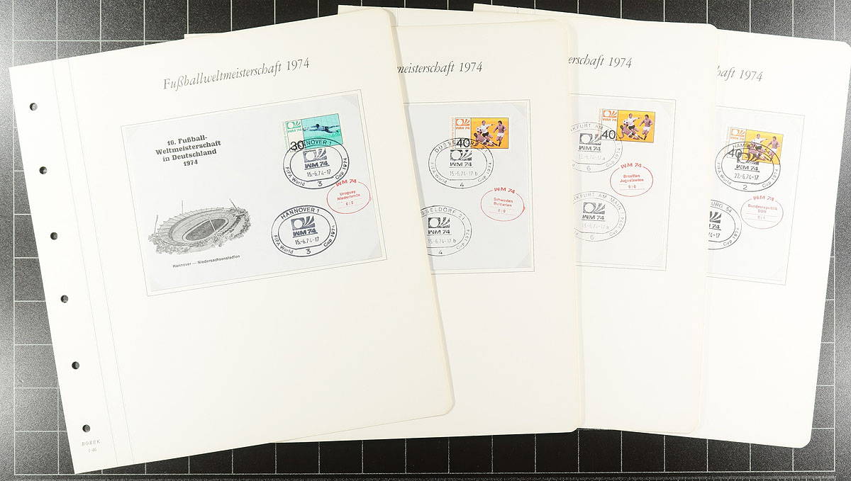 1974 World Cup "Borek" album pair in specialty 6-ring binder with hingeless pages. The first volume has 107 mint, never hinged, stamps, 20 souvenir sheets and a cover - apparently complete for the participating countries. The second is a group of 47 different German covers cancelled at the various stadiums where matches took place, some with added cachets indicating the score of the match. Great condition, not often seen and just in time for the upcoming matches in North America! Estimate =