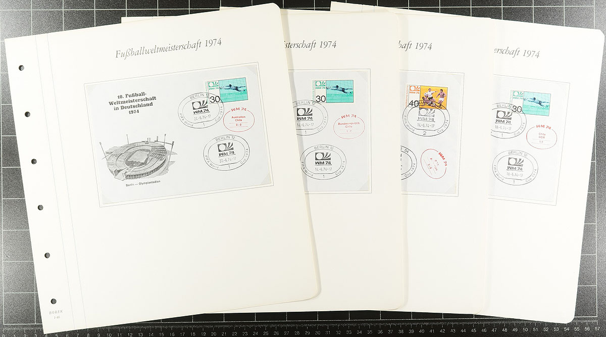 1974 World Cup "Borek" album pair in specialty 6-ring binder with hingeless pages. The first volume has 107 mint, never hinged, stamps, 20 souvenir sheets and a cover - apparently complete for the participating countries. The second is a group of 47 different German covers cancelled at the various stadiums where matches took place, some with added cachets indicating the score of the match. Great condition, not often seen and just in time for the upcoming matches in North America! Estimate =