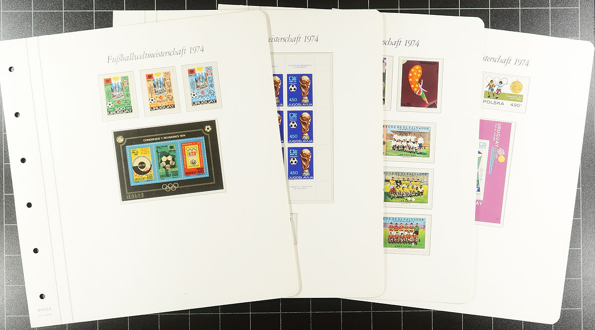 1974 World Cup "Borek" album pair in specialty 6-ring binder with hingeless pages. The first volume has 107 mint, never hinged, stamps, 20 souvenir sheets and a cover - apparently complete for the participating countries. The second is a group of 47 different German covers cancelled at the various stadiums where matches took place, some with added cachets indicating the score of the match. Great condition, not often seen and just in time for the upcoming matches in North America! Estimate =