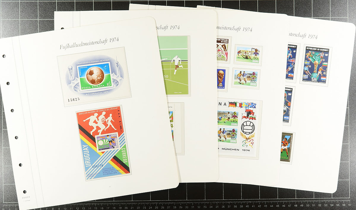 1974 World Cup "Borek" album pair in specialty 6-ring binder with hingeless pages. The first volume has 107 mint, never hinged, stamps, 20 souvenir sheets and a cover - apparently complete for the participating countries. The second is a group of 47 different German covers cancelled at the various stadiums where matches took place, some with added cachets indicating the score of the match. Great condition, not often seen and just in time for the upcoming matches in North America! Estimate =