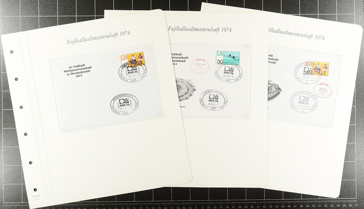1974 World Cup "Borek" album pair in specialty 6-ring binder with hingeless pages. The first volume has 107 mint, never hinged, stamps, 20 souvenir sheets and a cover - apparently complete for the participating countries. The second is a group of 47 different German covers cancelled at the various stadiums where matches took place, some with added cachets indicating the score of the match. Great condition, not often seen and just in time for the upcoming matches in North America! Estimate =