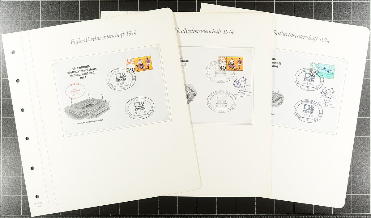 1974 World Cup "Borek" album pair in specialty 6-ring binder with hingeless pages. The first volume has 107 mint, never hinged, stamps, 20 souvenir sheets and a cover - apparently complete for the participating countries. The second is a group of 47 different German covers cancelled at the various stadiums where matches took place, some with added cachets indicating the score of the match. Great condition, not often seen and just in time for the upcoming matches in North America! Estimate =