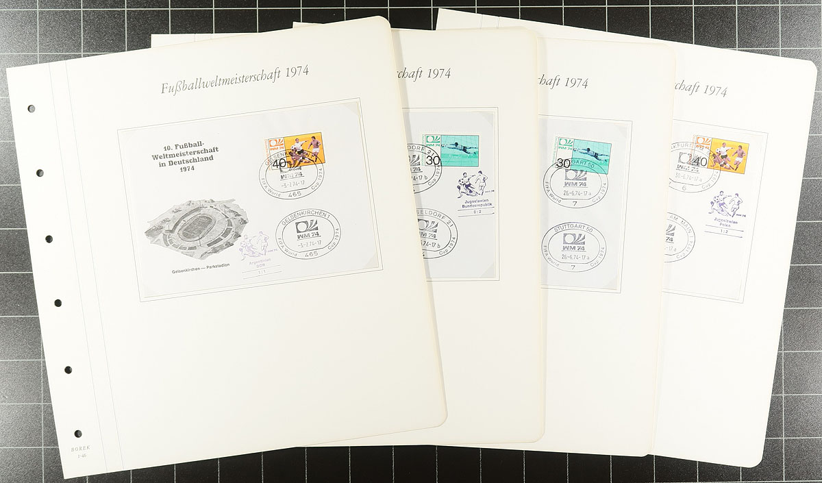 1974 World Cup "Borek" album pair in specialty 6-ring binder with hingeless pages. The first volume has 107 mint, never hinged, stamps, 20 souvenir sheets and a cover - apparently complete for the participating countries. The second is a group of 47 different German covers cancelled at the various stadiums where matches took place, some with added cachets indicating the score of the match. Great condition, not often seen and just in time for the upcoming matches in North America! Estimate =