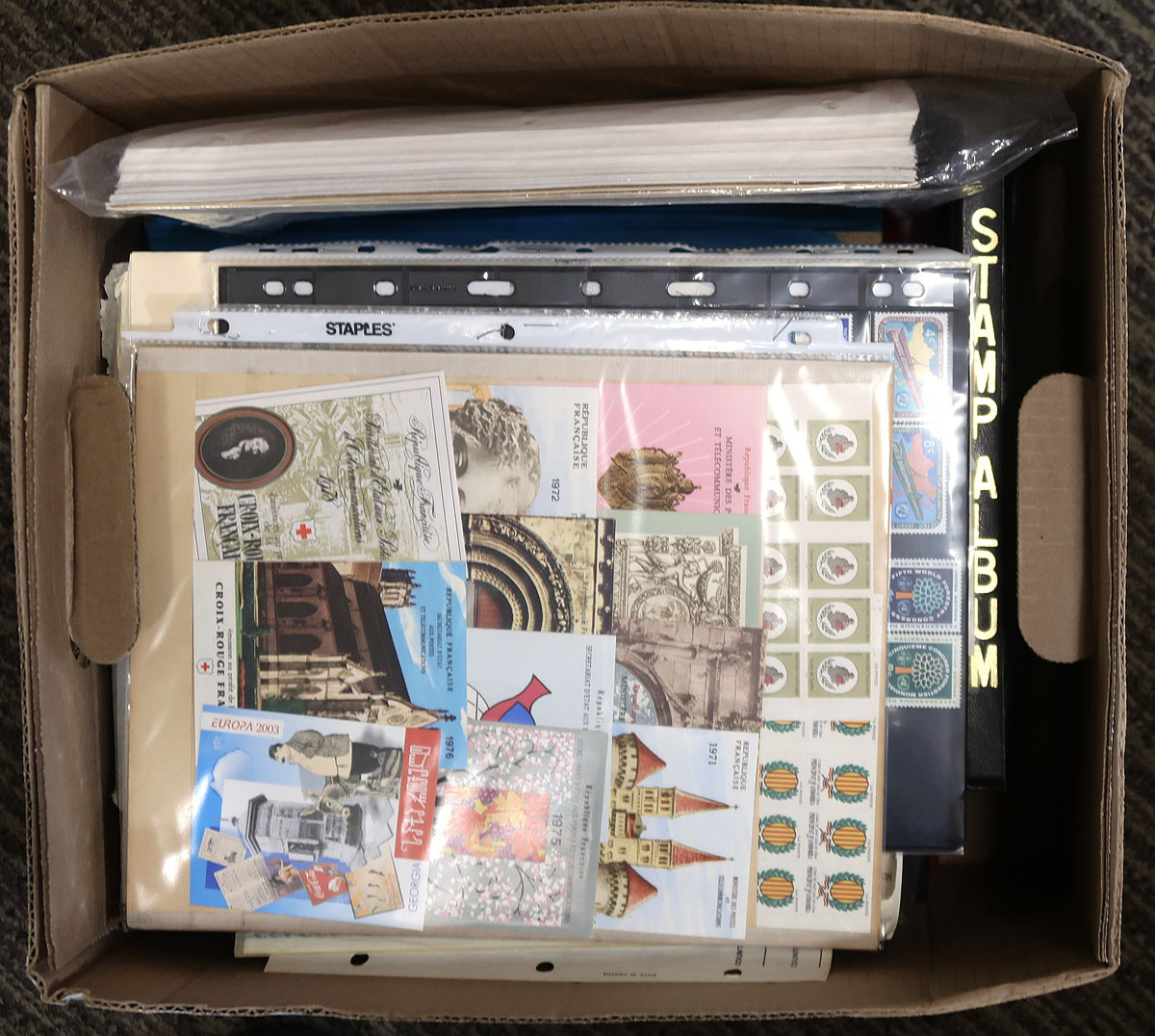 Collections, topicals, random pages. A perfect bankers box for the collector with diverse interests, either for acquiring, learning or selling. The seemingly random worldwide material includes a few one-country groups of sheets (Venezuela, Yugoslavia, Netherlands, Ireland, etc.). And from other countries there is a group of souvenir sheets and complete booklets. The topical section is eclectic, including 1975 "European Architectural Heritage" (Borek album, with Romania "Romulus and Remus souvenir sheet #2569a MNH and FDC - cat $140.00). "Art" on stamps from 1971-73 includes Singapore #153-156, with some Birds, Pharmacology and a "WWF" topical group of animals from c.1990. Enormous catalogue value and some unusual material here. Estimate =