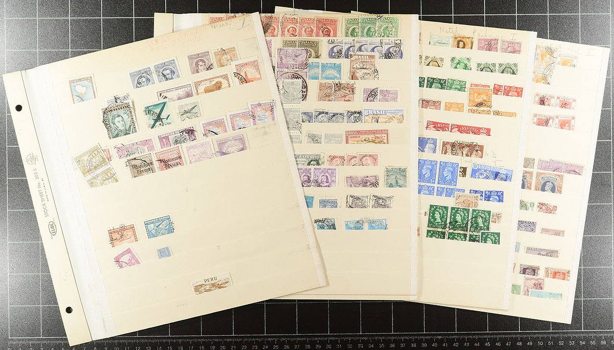 Collections, topicals, random pages. A perfect bankers box for the collector with diverse interests, either for acquiring, learning or selling. The seemingly random worldwide material includes a few one-country groups of sheets (Venezuela, Yugoslavia, Netherlands, Ireland, etc.). And from other countries there is a group of souvenir sheets and complete booklets. The topical section is eclectic, including 1975 "European Architectural Heritage" (Borek album, with Romania "Romulus and Remus souvenir sheet #2569a MNH and FDC - cat $140.00). "Art" on stamps from 1971-73 includes Singapore #153-156, with some Birds, Pharmacology and a "WWF" topical group of animals from c.1990. Enormous catalogue value and some unusual material here. Estimate =