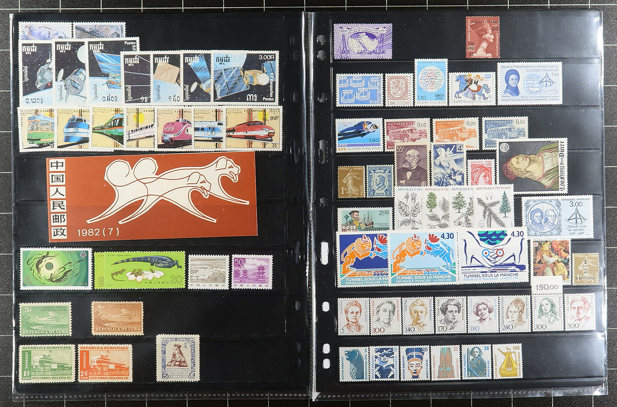 Collections, topicals, random pages. A perfect bankers box for the collector with diverse interests, either for acquiring, learning or selling. The seemingly random worldwide material includes a few one-country groups of sheets (Venezuela, Yugoslavia, Netherlands, Ireland, etc.). And from other countries there is a group of souvenir sheets and complete booklets. The topical section is eclectic, including 1975 "European Architectural Heritage" (Borek album, with Romania "Romulus and Remus souvenir sheet #2569a MNH and FDC - cat $140.00). "Art" on stamps from 1971-73 includes Singapore #153-156, with some Birds, Pharmacology and a "WWF" topical group of animals from c.1990. Enormous catalogue value and some unusual material here. Estimate =