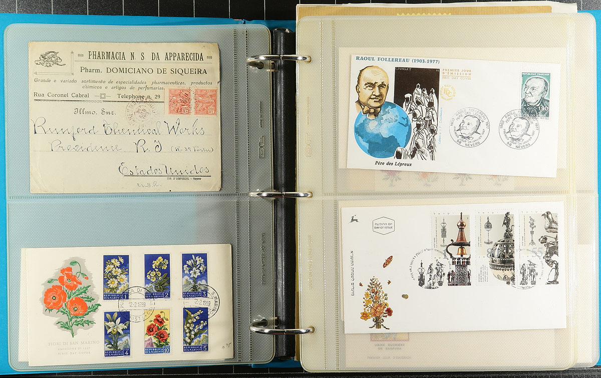 Collections, topicals, random pages. A perfect bankers box for the collector with diverse interests, either for acquiring, learning or selling. The seemingly random worldwide material includes a few one-country groups of sheets (Venezuela, Yugoslavia, Netherlands, Ireland, etc.). And from other countries there is a group of souvenir sheets and complete booklets. The topical section is eclectic, including 1975 "European Architectural Heritage" (Borek album, with Romania "Romulus and Remus souvenir sheet #2569a MNH and FDC - cat $140.00). "Art" on stamps from 1971-73 includes Singapore #153-156, with some Birds, Pharmacology and a "WWF" topical group of animals from c.1990. Enormous catalogue value and some unusual material here. Estimate =