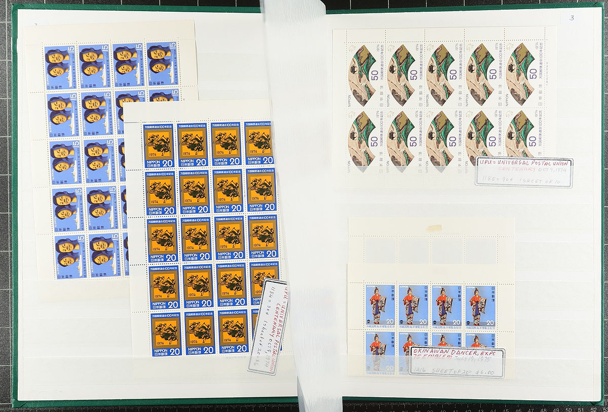 Complete mint panes of 10-20 stamps in a 16-page stockbook with more on stockpages. Includes issues from 1965-1997 with strength in the mid to late-1980's. All are VF, never hinged, but a few have tropical tone spots. As such, we are just listing the usable face value ¥29,600 in Canadian Dollars =