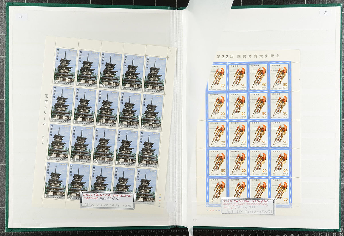Complete mint panes of 10-20 stamps in a 16-page stockbook with more on stockpages. Includes issues from 1965-1997 with strength in the mid to late-1980's. All are VF, never hinged, but a few have tropical tone spots. As such, we are just listing the usable face value ¥29,600 in Canadian Dollars =