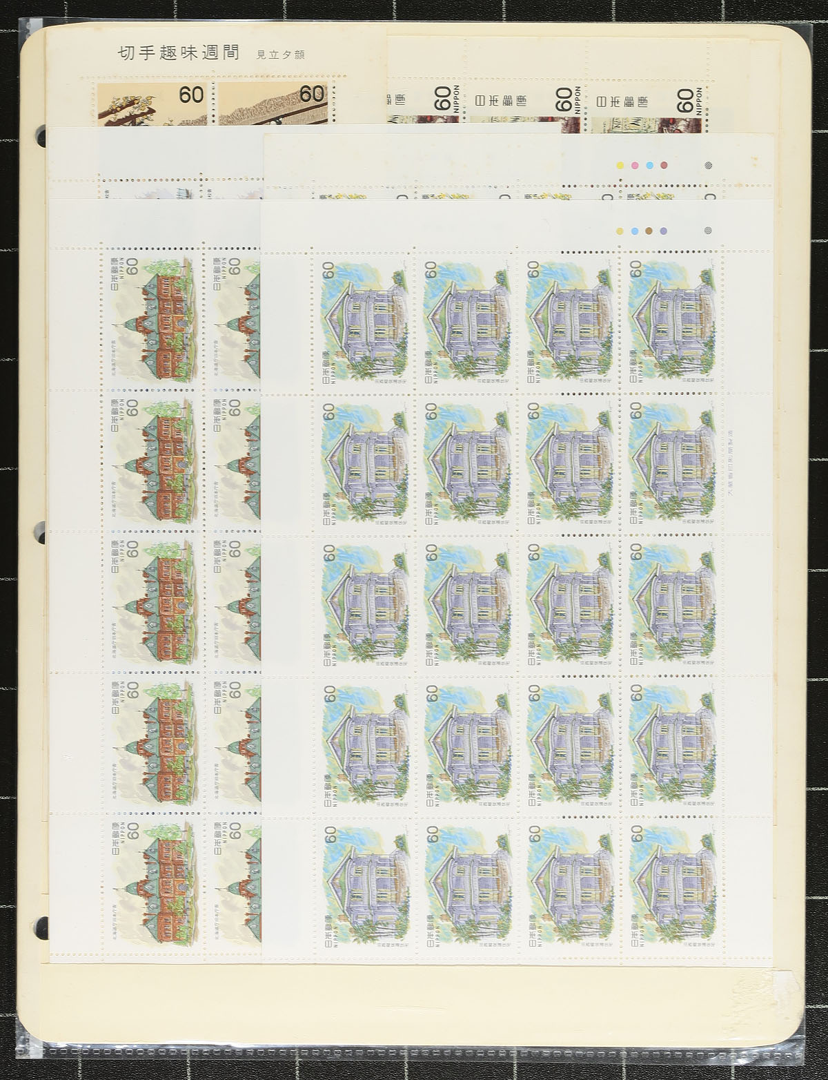 Complete mint panes of 10-20 stamps in a 16-page stockbook with more on stockpages. Includes issues from 1965-1997 with strength in the mid to late-1980's. All are VF, never hinged, but a few have tropical tone spots. As such, we are just listing the usable face value ¥29,600 in Canadian Dollars =