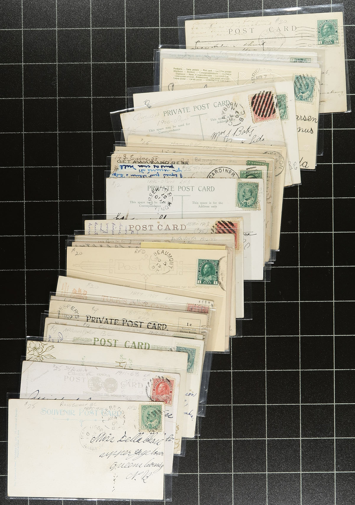 British Columbia Postal History. A select offering of TWO DOZEN (Part A) different BC split ring postmarks on postcard from the Edward / Admiral era. A great offering, from the estate of a long-time dealer, who had not taken a table at a show within the last decade (and likely this this "new" stock that never had the chance to go to a show). Many better offices here including Roseberry, Syringa Creek, Oak Bay, Arrow Park, Collingwood East, Keefers, Northfield, Deer Park, Beaumont, Tofino, Alta Vista, Coquitlam, Monte Creek, Tod Inlet, Brynmarl, Milnes Landing, Bonnington Falls, Harrop, Clayburn, Duncans Station, Gabriola Island, Collingwood West, Alta Vista and Glenemma. High-quality large offerings are seldom offered. Estimate =