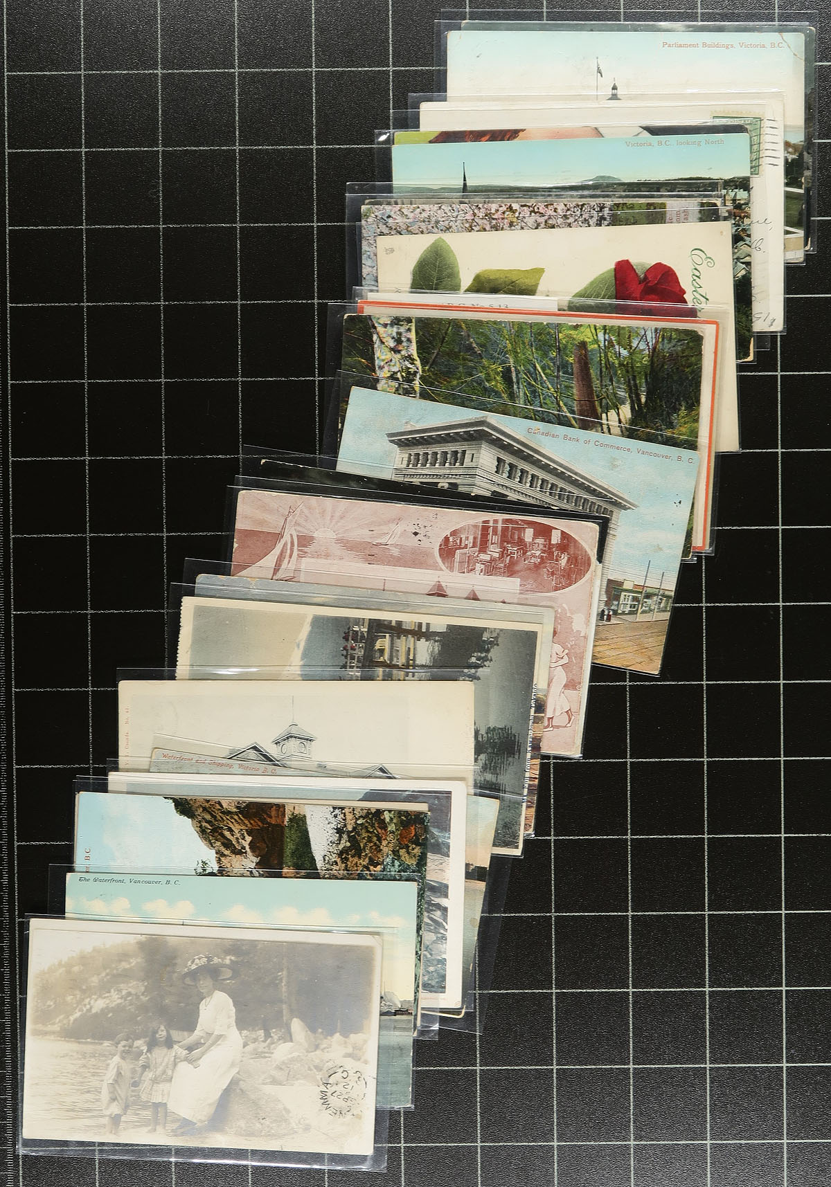 British Columbia Postal History. A select offering of TWO DOZEN (Part A) different BC split ring postmarks on postcard from the Edward / Admiral era. A great offering, from the estate of a long-time dealer, who had not taken a table at a show within the last decade (and likely this this "new" stock that never had the chance to go to a show). Many better offices here including Roseberry, Syringa Creek, Oak Bay, Arrow Park, Collingwood East, Keefers, Northfield, Deer Park, Beaumont, Tofino, Alta Vista, Coquitlam, Monte Creek, Tod Inlet, Brynmarl, Milnes Landing, Bonnington Falls, Harrop, Clayburn, Duncans Station, Gabriola Island, Collingwood West, Alta Vista and Glenemma. High-quality large offerings are seldom offered. Estimate =