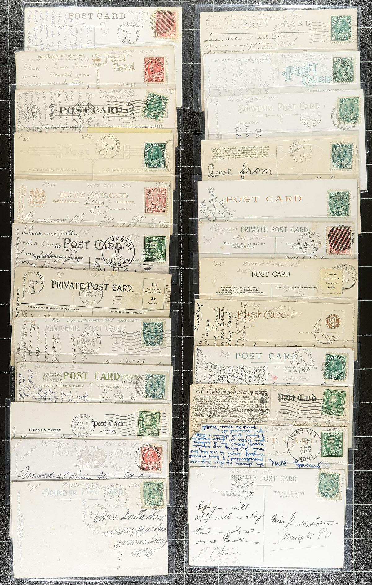British Columbia Postal History. A select offering of TWO DOZEN (Part A) different BC split ring postmarks on postcard from the Edward / Admiral era. A great offering, from the estate of a long-time dealer, who had not taken a table at a show within the last decade (and likely this this "new" stock that never had the chance to go to a show). Many better offices here including Roseberry, Syringa Creek, Oak Bay, Arrow Park, Collingwood East, Keefers, Northfield, Deer Park, Beaumont, Tofino, Alta Vista, Coquitlam, Monte Creek, Tod Inlet, Brynmarl, Milnes Landing, Bonnington Falls, Harrop, Clayburn, Duncans Station, Gabriola Island, Collingwood West, Alta Vista and Glenemma. High-quality large offerings are seldom offered. Estimate =
