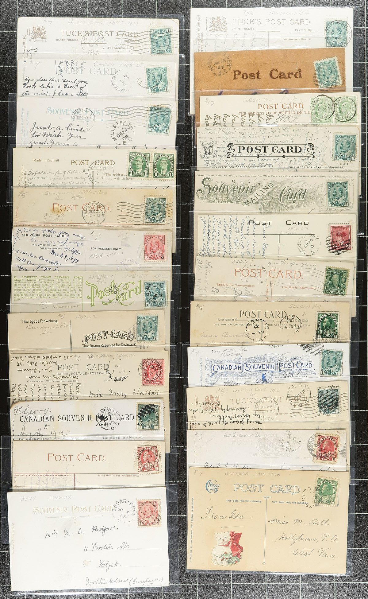 British Columbia Postal History. A select offering of TWO DOZEN (Part B) different BC split ring postmarks on postcard from the Edward / Admiral era. A great offering, from the estate of a long-time dealer, who had not taken a table at a show within the last decade (and likely this this "new" stock that never had the chance to go to a show). Many better offices here including Cedar Cove, Sooke, Fort George, Saltspring Island, Collingwood East, Wadhams, Wycliffe, Dewdney, Shoreacres, Millstream, Baker, Royal Oak, Hollyburn, Alta Lake, Union Bay, Wilmer, Slocan, Fraser Mills, Cordova Bay, Field, Pitt Meadows, Cobble Hill, Harrison River and Maywood. High-quality large offerings are seldom offered. Estimate =
