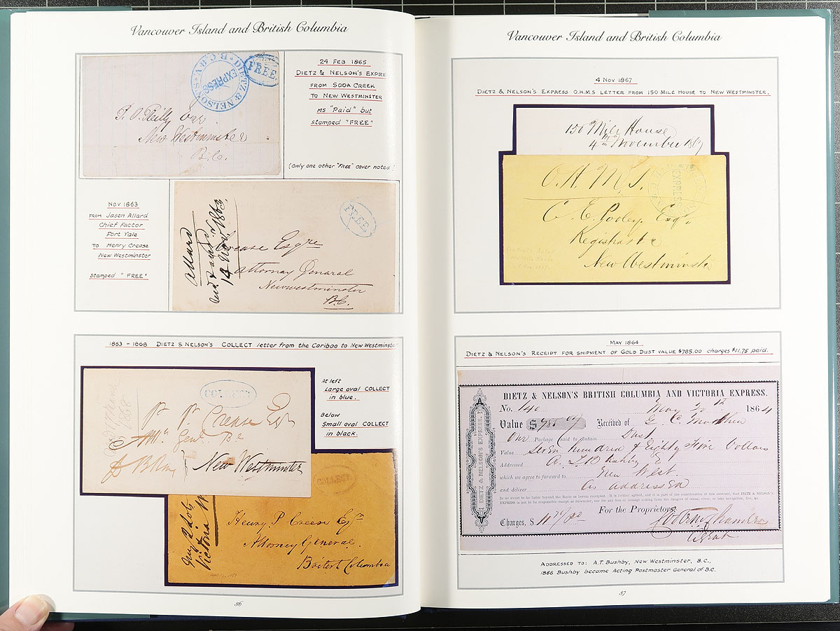 British Columbia Literature. Gerald Wellburn's exceptional "The Stamps and Postal History of Vancouver Island & British Columbia". Large format, high definition full colour coffee table book depicting one of the most magnificent BC and Vancouver Island collections ever formed. A must-have for the BC collector! In VF condition with intact dust jacket. Long out of print. Original retail =