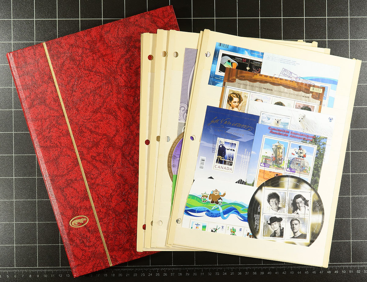 Lovely group of used souvenir sheets, 1970's-2010's, containing roughly 125 souvenir sheets or panes, in a stockbook and in a few manila stock pages. The lot generally ranges from Unitrade #756a/2805, noting material ranging from $3 to $5 each. Duplication does exist, generally 3 to 5 each for some issues. We note POCON postmarks generally from Vancouver, Ontario and Quebec. A nice lot for the used collector. Estimate =
