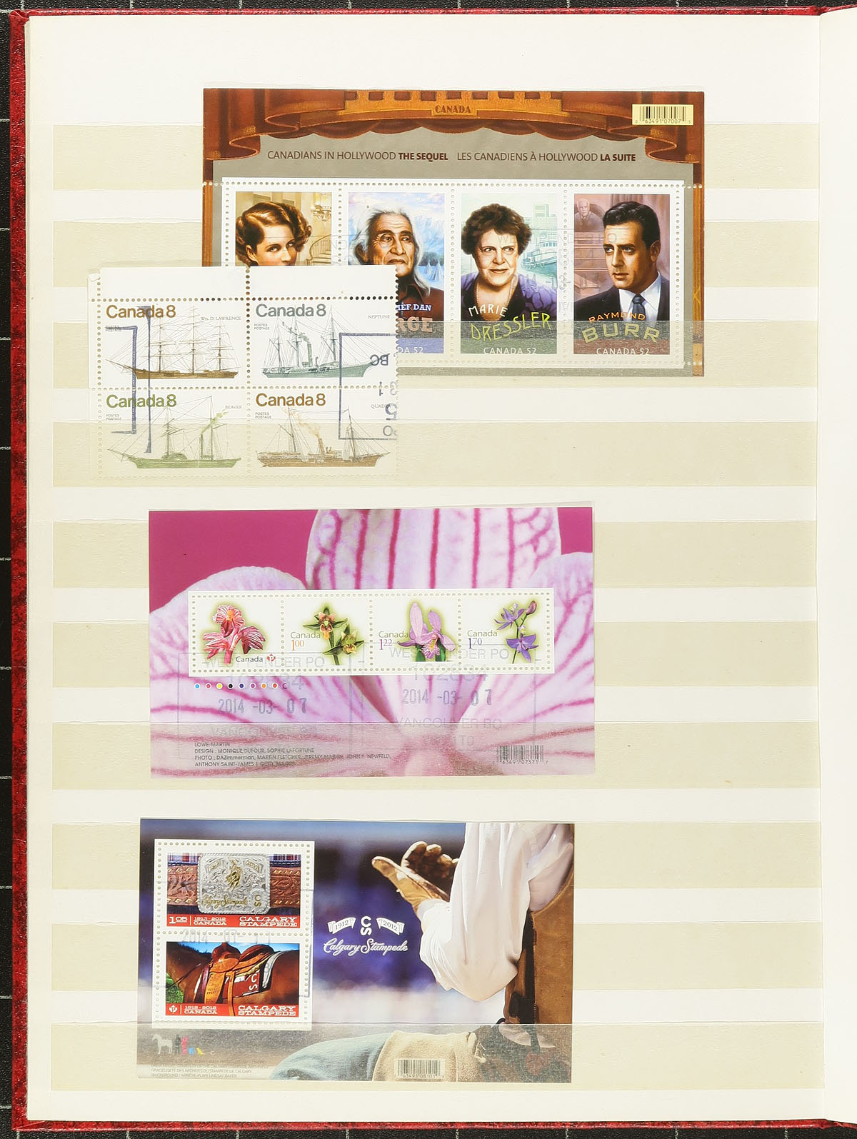 Lovely group of used souvenir sheets, 1970's-2010's, containing roughly 125 souvenir sheets or panes, in a stockbook and in a few manila stock pages. The lot generally ranges from Unitrade #756a/2805, noting material ranging from $3 to $5 each. Duplication does exist, generally 3 to 5 each for some issues. We note POCON postmarks generally from Vancouver, Ontario and Quebec. A nice lot for the used collector. Estimate =