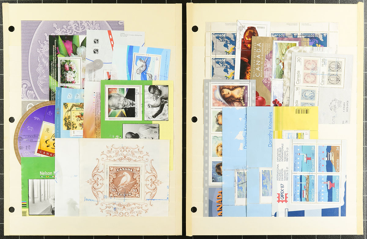 Lovely group of used souvenir sheets, 1970's-2010's, containing roughly 125 souvenir sheets or panes, in a stockbook and in a few manila stock pages. The lot generally ranges from Unitrade #756a/2805, noting material ranging from $3 to $5 each. Duplication does exist, generally 3 to 5 each for some issues. We note POCON postmarks generally from Vancouver, Ontario and Quebec. A nice lot for the used collector. Estimate =
