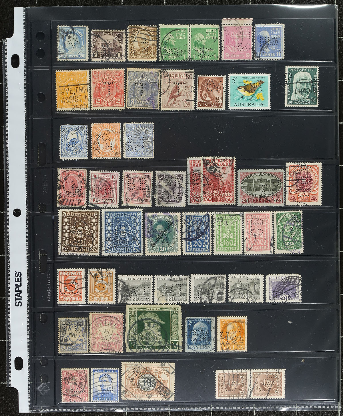 Perfin Mini-Hoard. Semi-sorted group of 740 lightly duplicated worldwide perfins, either organized on stockpages or loose in an envelope. 26 different countries represented, including USA, Australia, AAT, New South Wales, Queensland, Austria, Bavaria, Belgium, Canada, Denmark, Egypt, Ethiopia, France, Germany, GB, Iceland, Ireland, Japan, Netherlands, Netherlands Indies, Norway, Portugal, Romania, Straits Settlements, Switzerland, etc. The vast majority are pre-1945 and according to the consignor includes some better Danish items. Estimate =