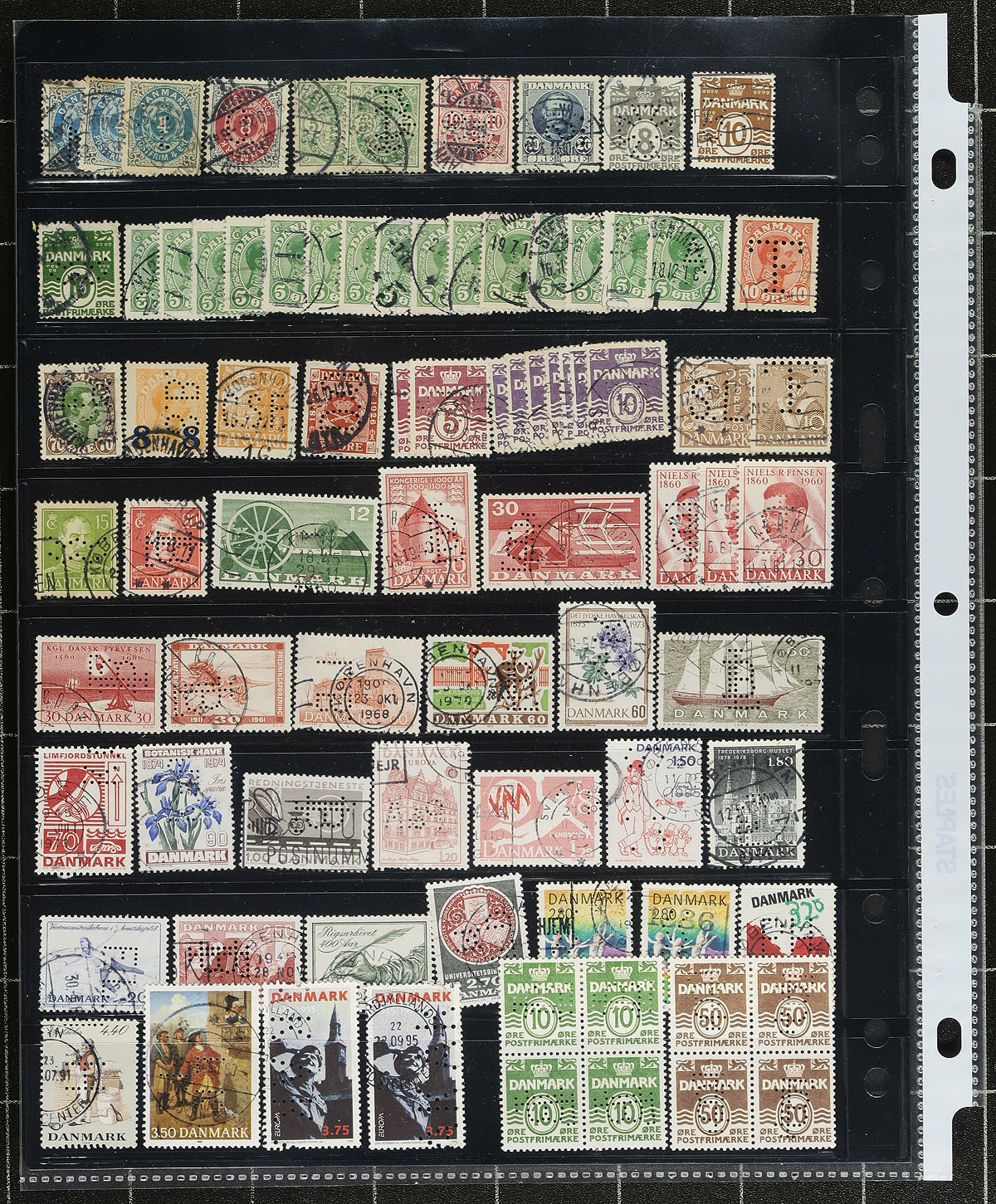 Perfin Mini-Hoard. Semi-sorted group of 740 lightly duplicated worldwide perfins, either organized on stockpages or loose in an envelope. 26 different countries represented, including USA, Australia, AAT, New South Wales, Queensland, Austria, Bavaria, Belgium, Canada, Denmark, Egypt, Ethiopia, France, Germany, GB, Iceland, Ireland, Japan, Netherlands, Netherlands Indies, Norway, Portugal, Romania, Straits Settlements, Switzerland, etc. The vast majority are pre-1945 and according to the consignor includes some better Danish items. Estimate =