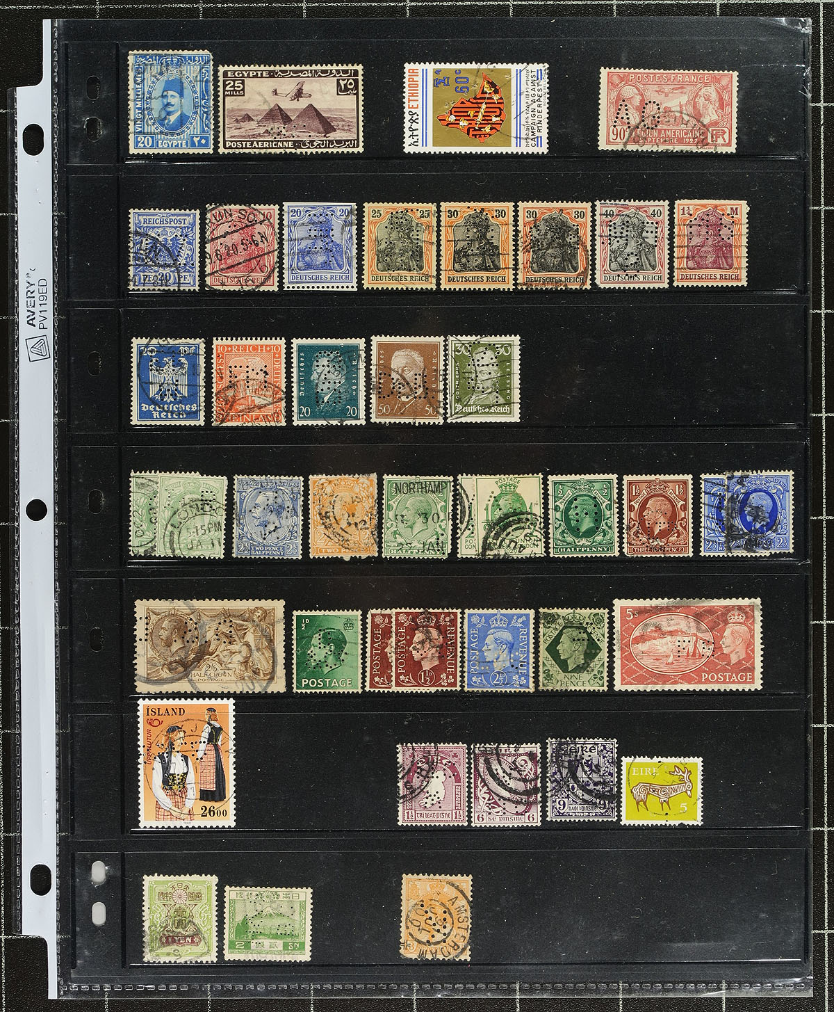 Perfin Mini-Hoard. Semi-sorted group of 740 lightly duplicated worldwide perfins, either organized on stockpages or loose in an envelope. 26 different countries represented, including USA, Australia, AAT, New South Wales, Queensland, Austria, Bavaria, Belgium, Canada, Denmark, Egypt, Ethiopia, France, Germany, GB, Iceland, Ireland, Japan, Netherlands, Netherlands Indies, Norway, Portugal, Romania, Straits Settlements, Switzerland, etc. The vast majority are pre-1945 and according to the consignor includes some better Danish items. Estimate =