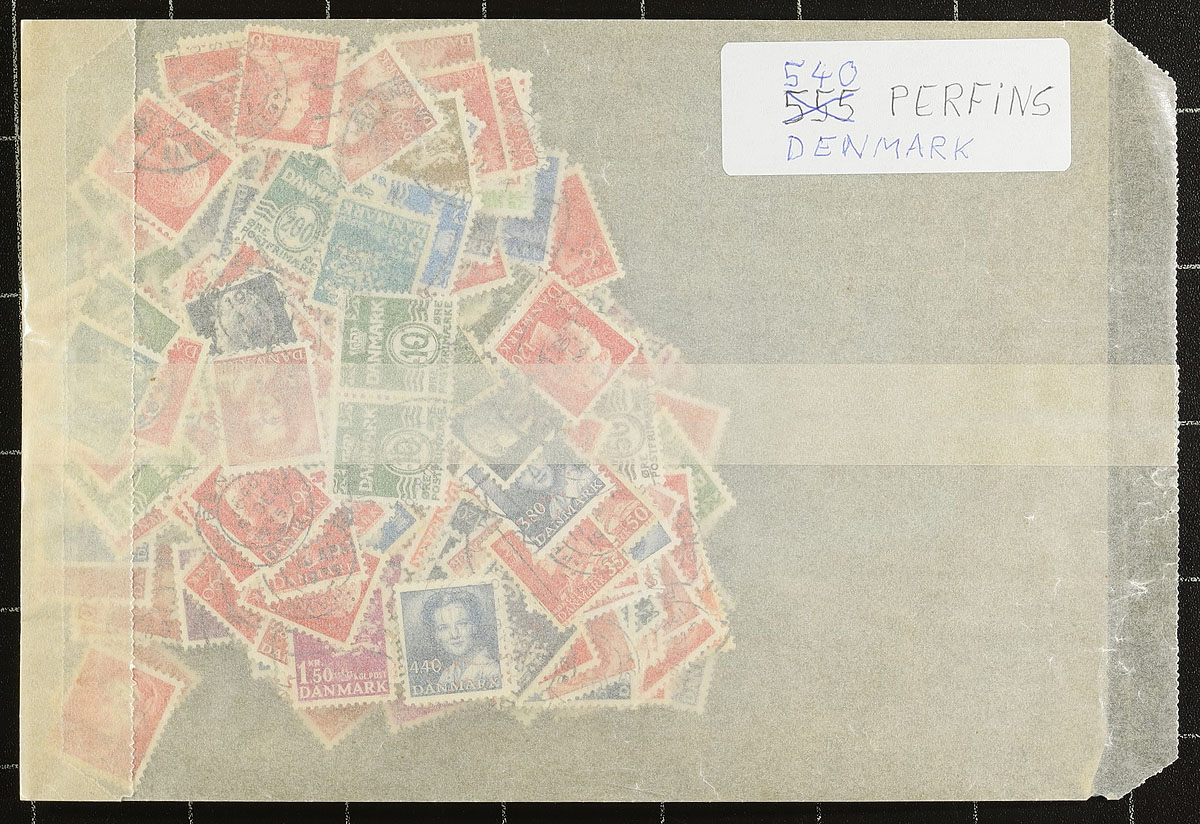 Perfin Mini-Hoard. Semi-sorted group of 740 lightly duplicated worldwide perfins, either organized on stockpages or loose in an envelope. 26 different countries represented, including USA, Australia, AAT, New South Wales, Queensland, Austria, Bavaria, Belgium, Canada, Denmark, Egypt, Ethiopia, France, Germany, GB, Iceland, Ireland, Japan, Netherlands, Netherlands Indies, Norway, Portugal, Romania, Straits Settlements, Switzerland, etc. The vast majority are pre-1945 and according to the consignor includes some better Danish items. Estimate =