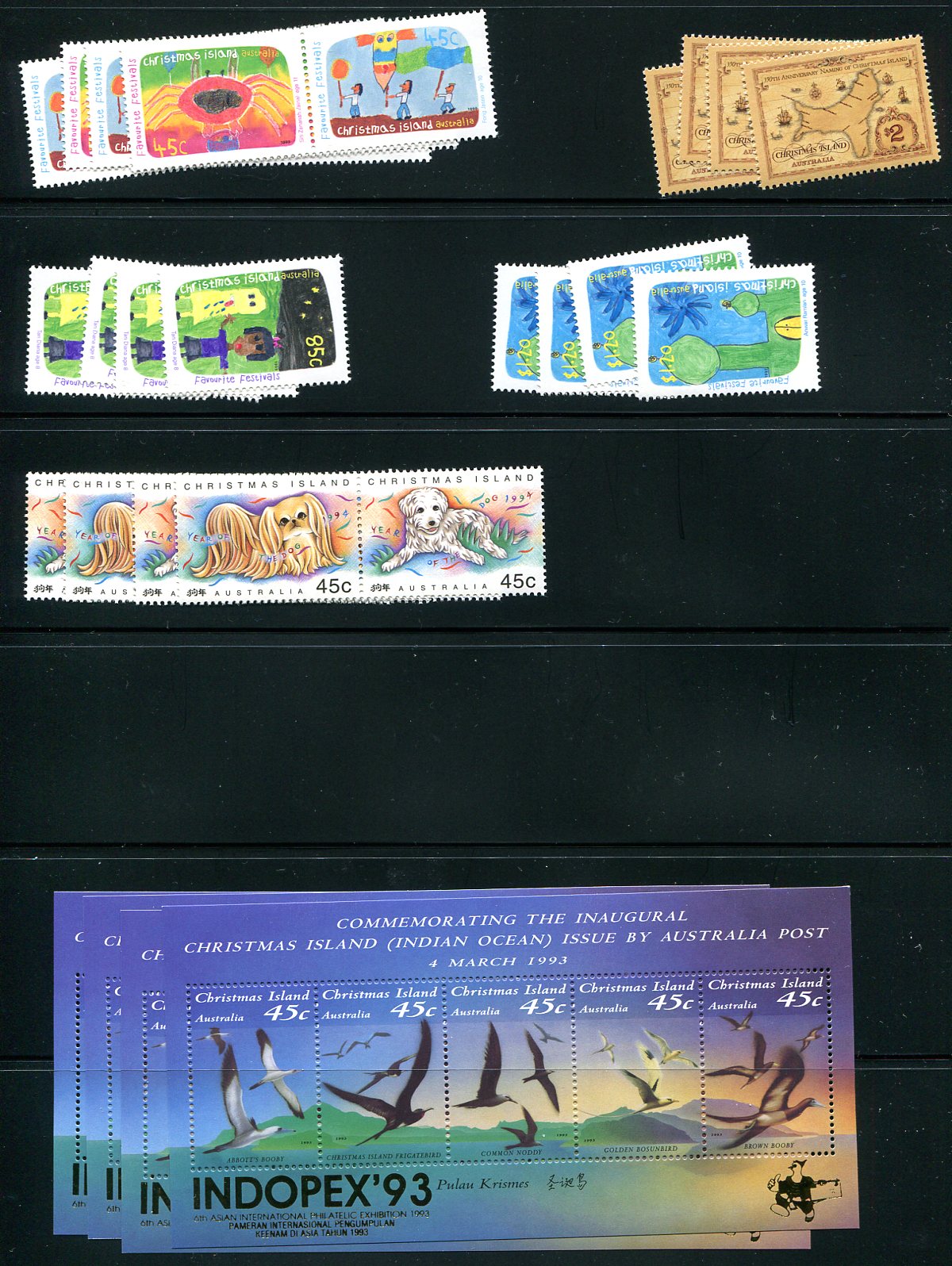VF mint, all Never Hinged balanced duplicated selection (4 examples of each) of 108 stamps and 28 souvenir sheets, 1993 to 1999 period issues, all complete sets. Harder to find than older issues. High useable total face value ($108.40 Australian Dollars). Includes great topicals (flora, fauna, trains, Lunar New Year, stamp show overprints, etc…). Perfect quantities for the British Commonwealth or topical dealer. Owner's 2021 Scott US$347.80 =