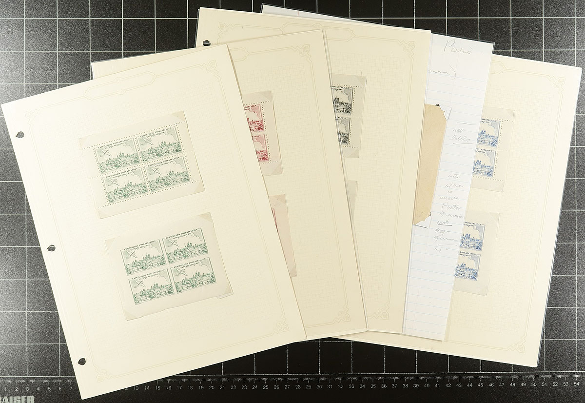 Air Mail Exposition Cinderellas. Exceptional group of "La Poste Aerienne" labels and imperf label trial colour proofs issued in conjunction with the 1943 Paris Philatelic Exposition. The lot consists of gummed and perforated panes of four labels in four different colours (black, claret, blue green and blue) with matching colour imperforate panes of four. A cover with the commemorative show cancel and label affixed also accompanies. The aircraft depicted on the labels (and cancel) is most certainly a French manufacture Caudron C445 Goeland twin engined utility aircraft and the view of Paris depicted on the labels is nearly identical the view on #C22, the 1947 issue 500fr French air mail stamp! Attending a stamp show in Paris during the WWII German occupation must have been an odd experience, to say the least. Note: production of the C445 resumed after the war. All in all this is a great lot for the aerophilatelist, stamp exposition ephemera collector or WWII enthusiast. Well worth further research. Estimate =