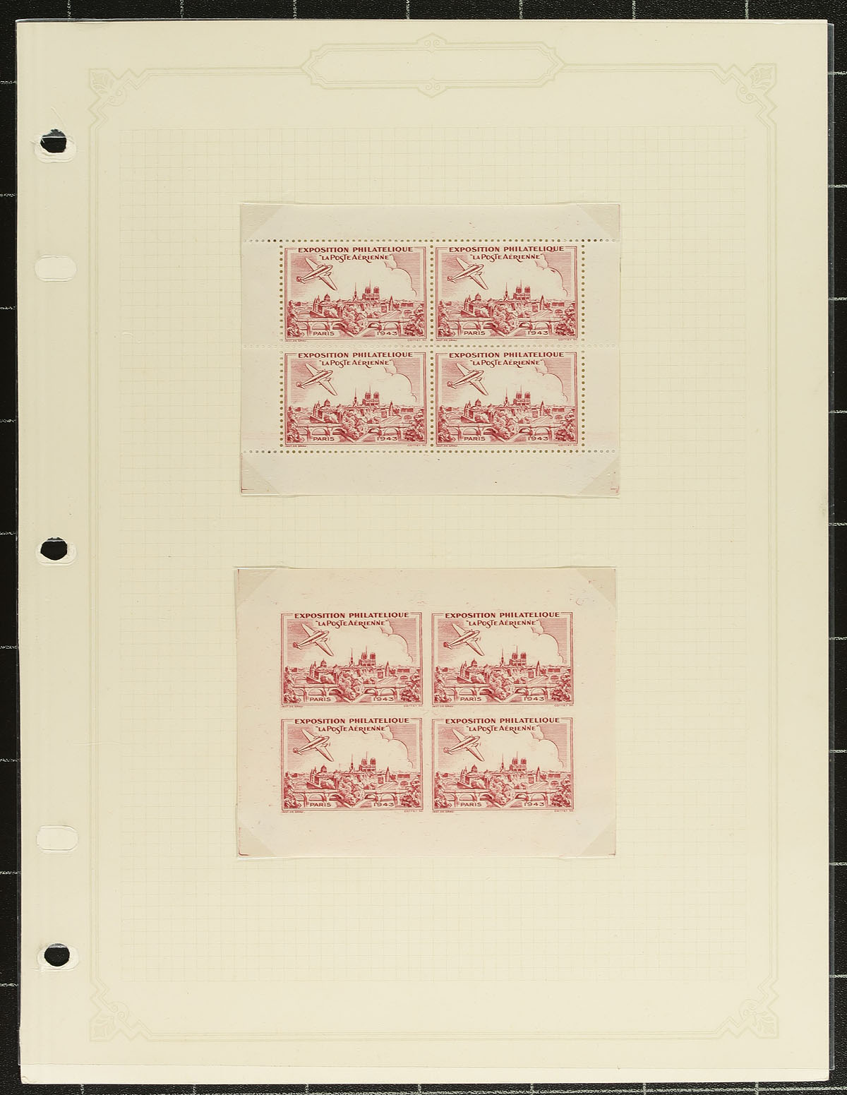 Air Mail Exposition Cinderellas. Exceptional group of "La Poste Aerienne" labels and imperf label trial colour proofs issued in conjunction with the 1943 Paris Philatelic Exposition. The lot consists of gummed and perforated panes of four labels in four different colours (black, claret, blue green and blue) with matching colour imperforate panes of four. A cover with the commemorative show cancel and label affixed also accompanies. The aircraft depicted on the labels (and cancel) is most certainly a French manufacture Caudron C445 Goeland twin engined utility aircraft and the view of Paris depicted on the labels is nearly identical the view on #C22, the 1947 issue 500fr French air mail stamp! Attending a stamp show in Paris during the WWII German occupation must have been an odd experience, to say the least. Note: production of the C445 resumed after the war. All in all this is a great lot for the aerophilatelist, stamp exposition ephemera collector or WWII enthusiast. Well worth further research. Estimate =