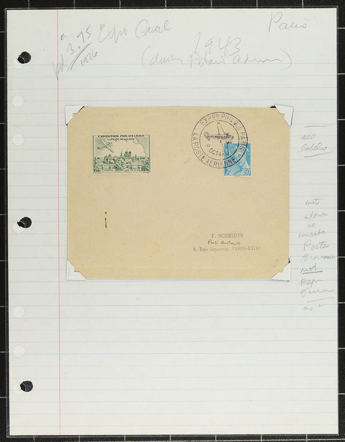 Air Mail Exposition Cinderellas. Exceptional group of "La Poste Aerienne" labels and imperf label trial colour proofs issued in conjunction with the 1943 Paris Philatelic Exposition. The lot consists of gummed and perforated panes of four labels in four different colours (black, claret, blue green and blue) with matching colour imperforate panes of four. A cover with the commemorative show cancel and label affixed also accompanies. The aircraft depicted on the labels (and cancel) is most certainly a French manufacture Caudron C445 Goeland twin engined utility aircraft and the view of Paris depicted on the labels is nearly identical the view on #C22, the 1947 issue 500fr French air mail stamp! Attending a stamp show in Paris during the WWII German occupation must have been an odd experience, to say the least. Note: production of the C445 resumed after the war. All in all this is a great lot for the aerophilatelist, stamp exposition ephemera collector or WWII enthusiast. Well worth further research. Estimate =