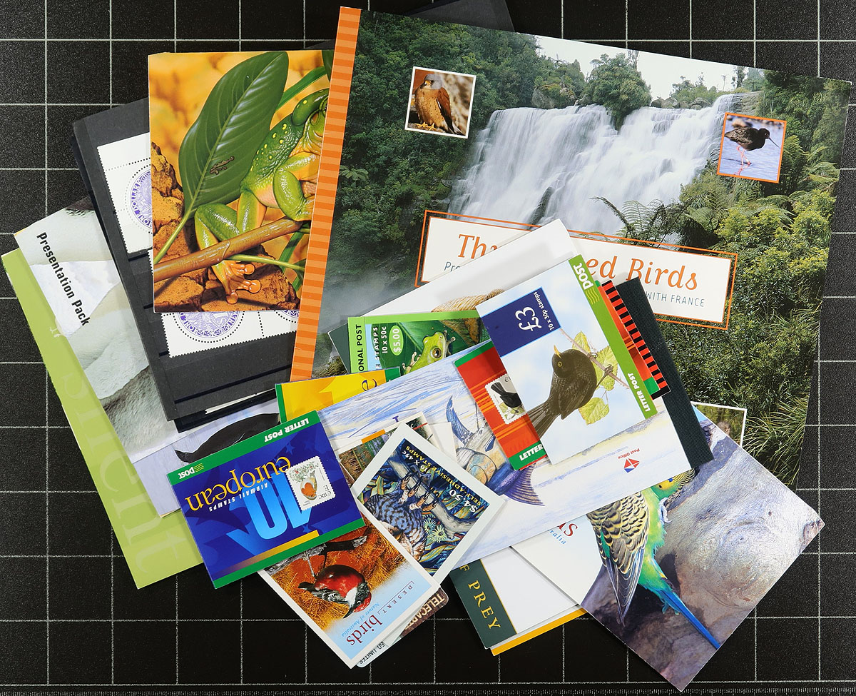 Bird Topicals. Fresh mint Never Hinged group of booklets, collector folders and mint strips (plus a phone card from FSAT) featuring Birds on Stamps, with many issues holding value as mint postage for the USA, Australia and New Zealand. Estimate =