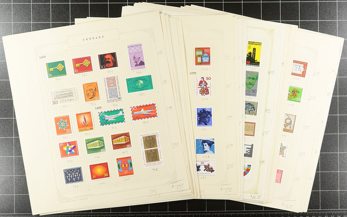 F/VF quality mint Hinged and used collection of 597 different stamps and 8 souvenir sheets/miniature panes, all Federal Republic 1949 to 1980 period issues. All neatly laid out, accurately identified and priced on the original quadrille album pages. An exceptional start to a very clean and comprehensive run of the regular early post-war Federal issues. No "Back of the Book" material in this lot. Owner's 2016 Scott US$761.60 =
