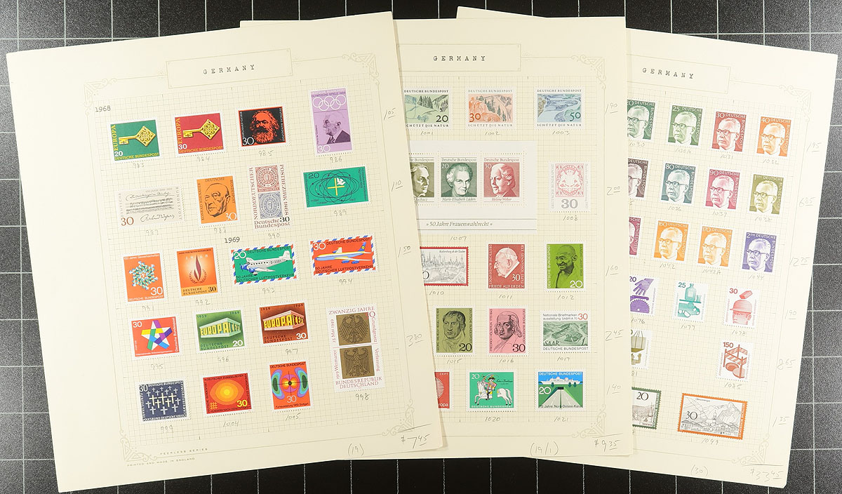 F/VF quality mint Hinged and used collection of 597 different stamps and 8 souvenir sheets/miniature panes, all Federal Republic 1949 to 1980 period issues. All neatly laid out, accurately identified and priced on the original quadrille album pages. An exceptional start to a very clean and comprehensive run of the regular early post-war Federal issues. No "Back of the Book" material in this lot. Owner's 2016 Scott US$761.60 =