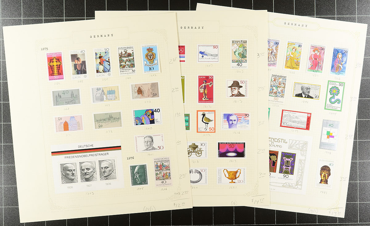 F/VF quality mint Hinged and used collection of 597 different stamps and 8 souvenir sheets/miniature panes, all Federal Republic 1949 to 1980 period issues. All neatly laid out, accurately identified and priced on the original quadrille album pages. An exceptional start to a very clean and comprehensive run of the regular early post-war Federal issues. No "Back of the Book" material in this lot. Owner's 2016 Scott US$761.60 =