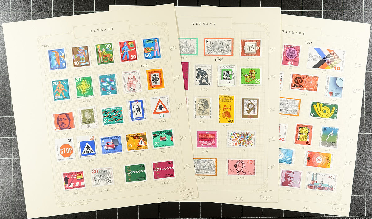 F/VF quality mint Hinged and used collection of 597 different stamps and 8 souvenir sheets/miniature panes, all Federal Republic 1949 to 1980 period issues. All neatly laid out, accurately identified and priced on the original quadrille album pages. An exceptional start to a very clean and comprehensive run of the regular early post-war Federal issues. No "Back of the Book" material in this lot. Owner's 2016 Scott US$761.60 =