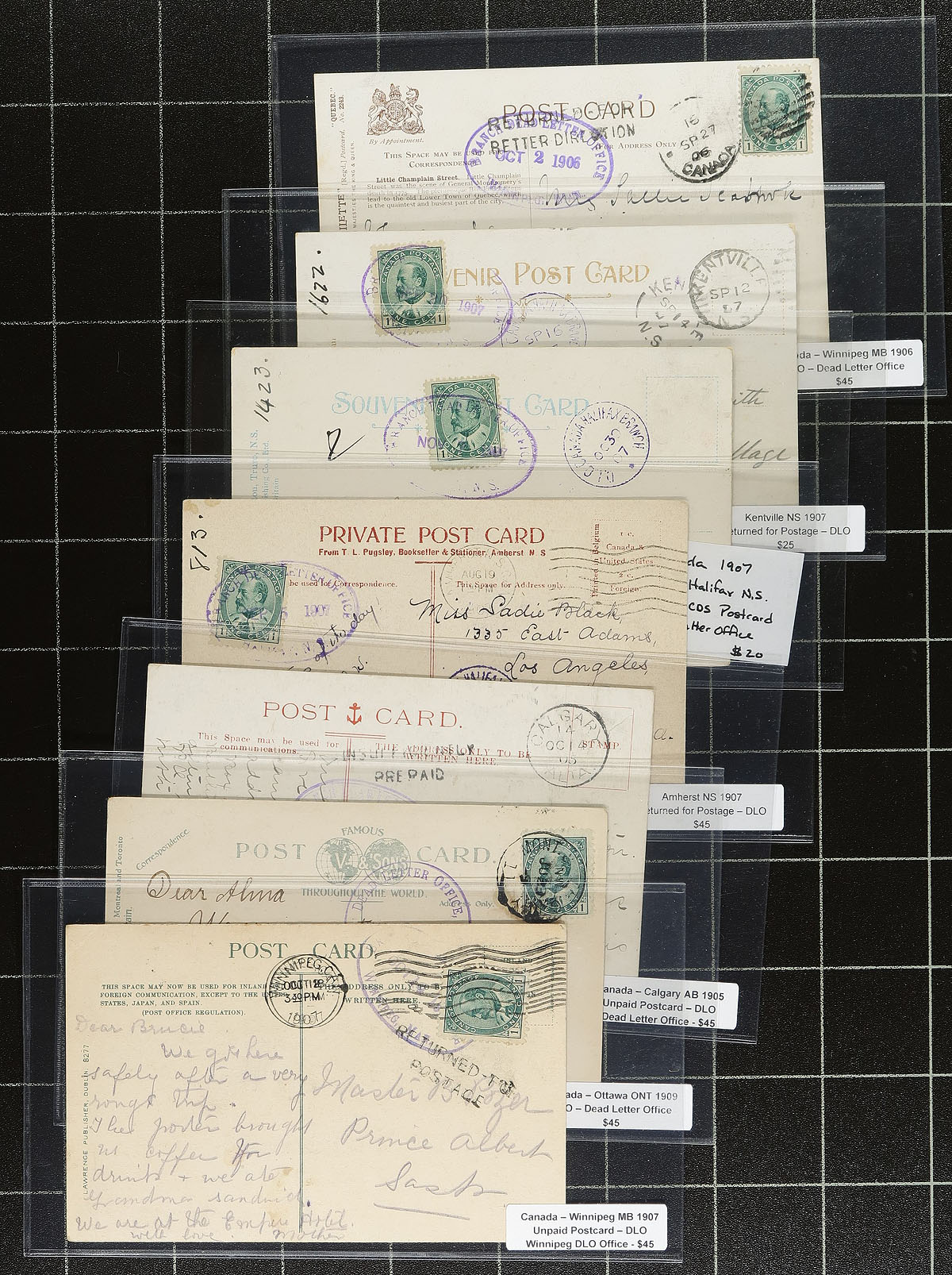 DLO Dead Letter Office. A selection of seven Edward era postcards, all with "Dead Letter Office" postmarks. Arriving for a variety of reasons (usually shortpaid, or poorly addressed), these items would sit at the Dead Letter Office until the receiver could be found (and if owing, remitted payment). A diverse offering which includes DLO markings from Halifax, Ottawa and Winnipeg. Each item is individually sleeved and priced. Total retail as marked =