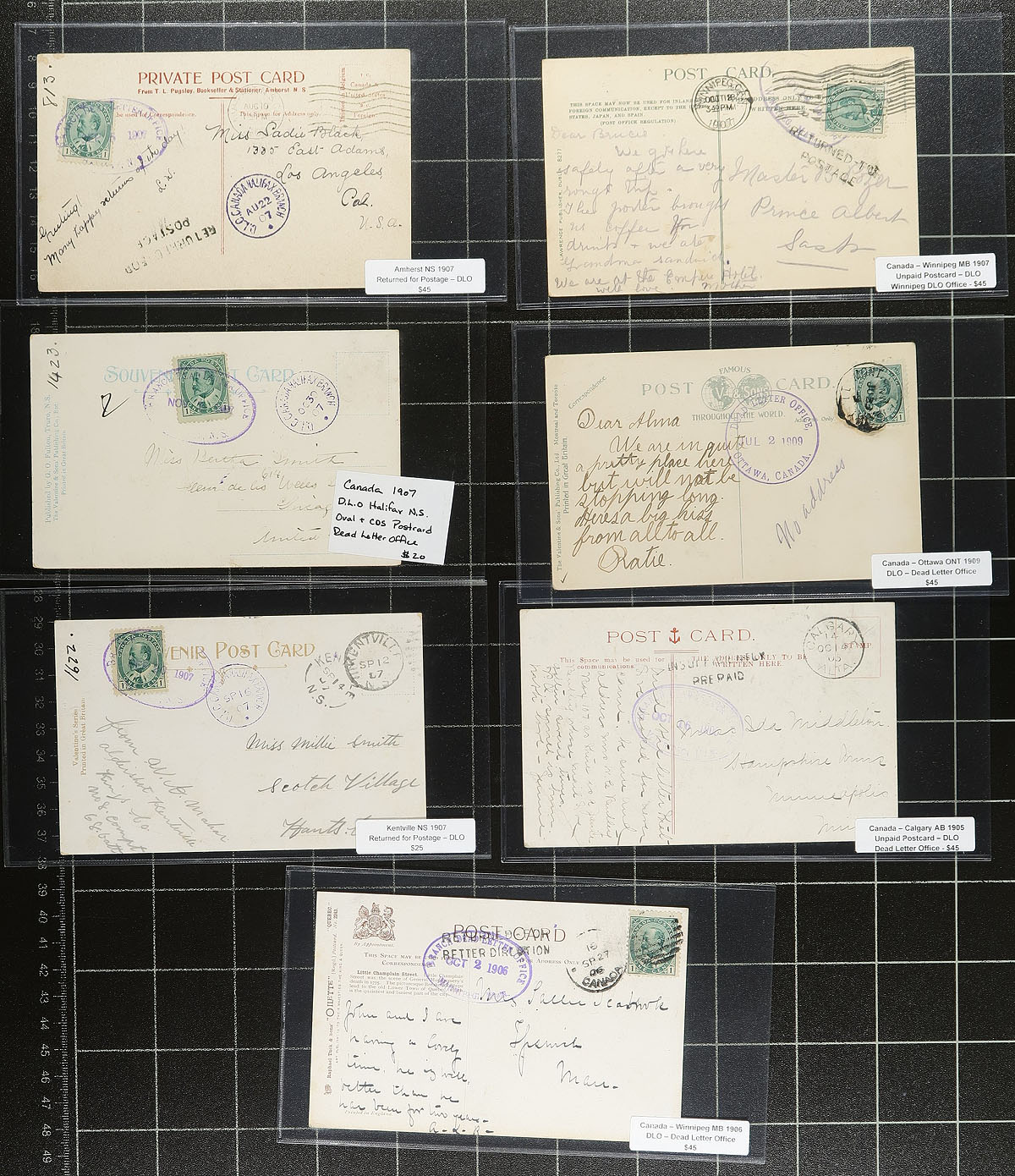 DLO Dead Letter Office. A selection of seven Edward era postcards, all with "Dead Letter Office" postmarks. Arriving for a variety of reasons (usually shortpaid, or poorly addressed), these items would sit at the Dead Letter Office until the receiver could be found (and if owing, remitted payment). A diverse offering which includes DLO markings from Halifax, Ottawa and Winnipeg. Each item is individually sleeved and priced. Total retail as marked =