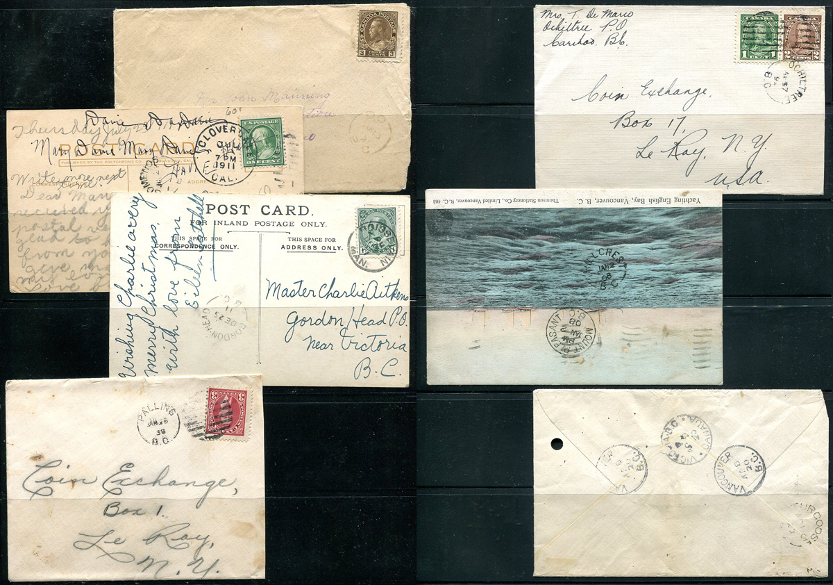British Columbia Postal History. An "all better" selection of 7 different BC split ring town cancels, 1911-1936 on cover or postcard. Towns include Hillcrest 1908, Ochiltree 1936, Palling 1938, Turgoose 1920, Somenos 1911, Gordon Head 1911 and Dot 1921. Some tough to find postmarks here! Estimate =