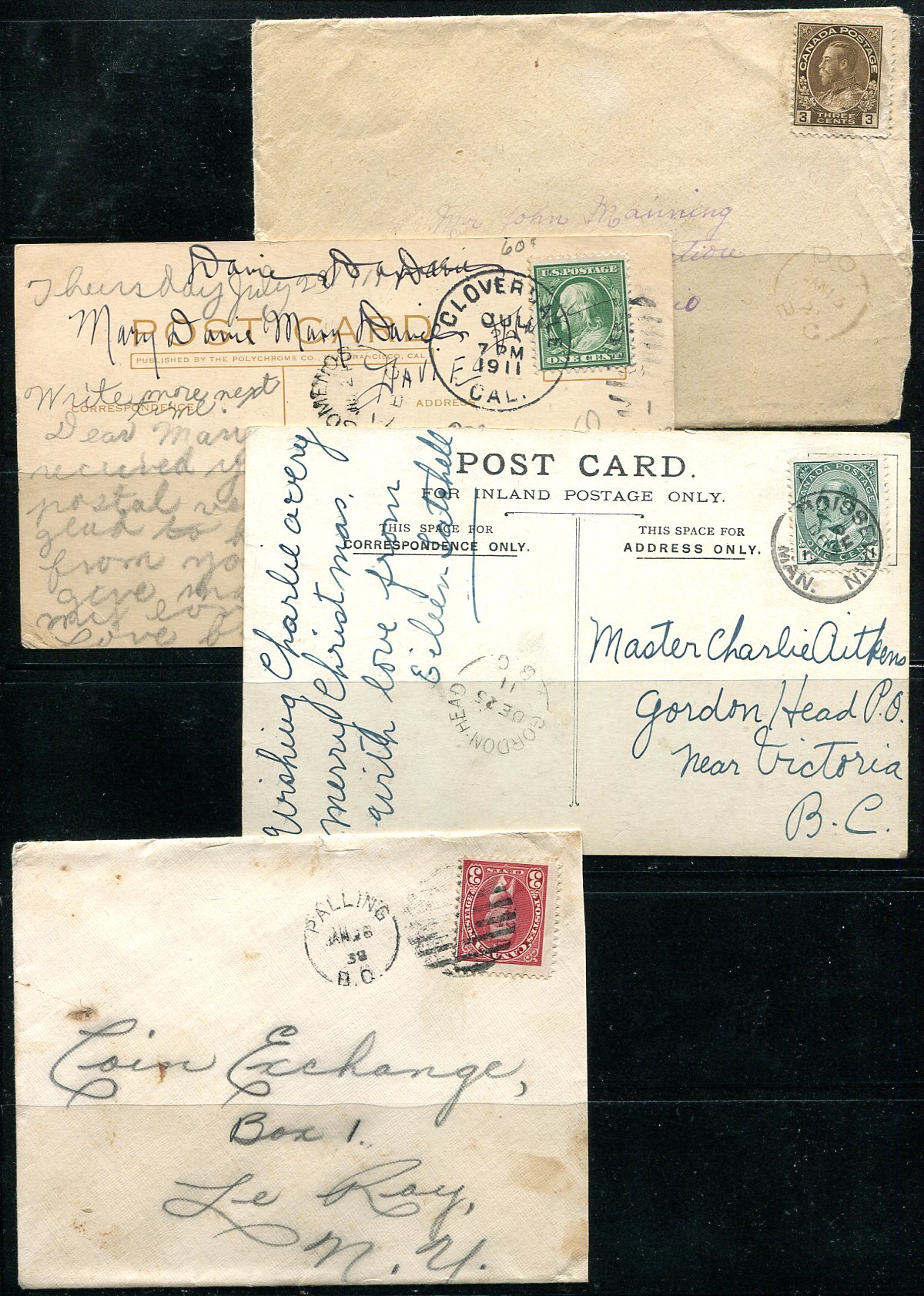 British Columbia Postal History. An "all better" selection of 7 different BC split ring town cancels, 1911-1936 on cover or postcard. Towns include Hillcrest 1908, Ochiltree 1936, Palling 1938, Turgoose 1920, Somenos 1911, Gordon Head 1911 and Dot 1921. Some tough to find postmarks here! Estimate =