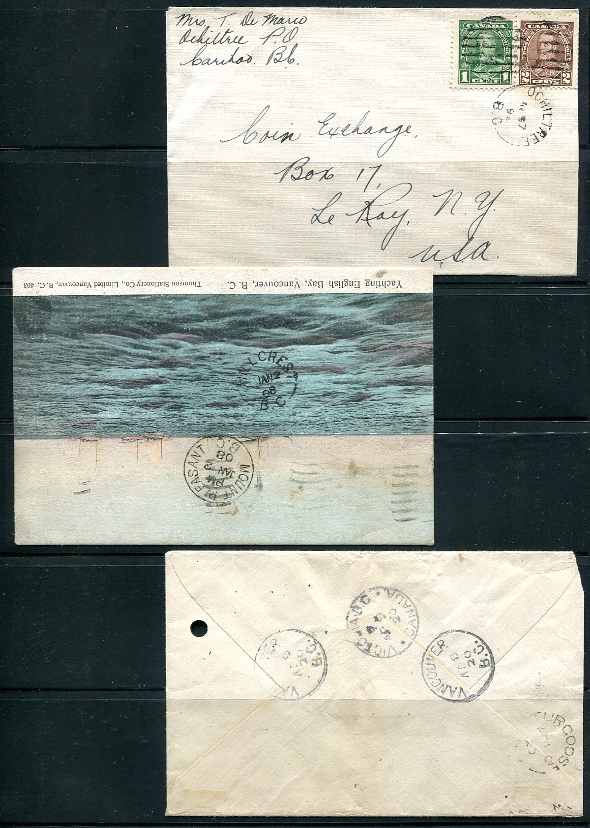 British Columbia Postal History. An "all better" selection of 7 different BC split ring town cancels, 1911-1936 on cover or postcard. Towns include Hillcrest 1908, Ochiltree 1936, Palling 1938, Turgoose 1920, Somenos 1911, Gordon Head 1911 and Dot 1921. Some tough to find postmarks here! Estimate =