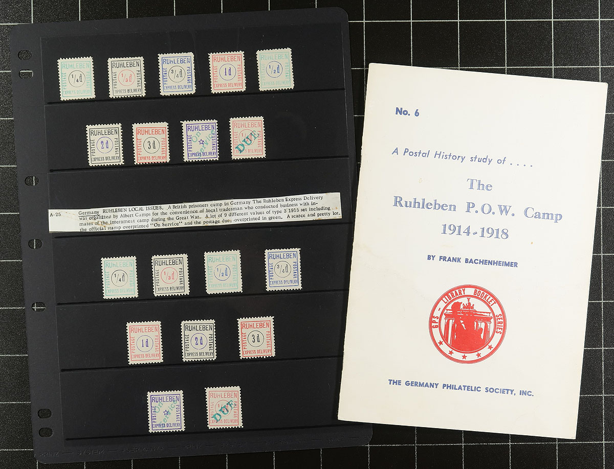 A duo of complete sets of 9 stamps (mint, never hinged) issued 1915 in Ruhleben during WWI for use in the British Prisoner or War Camp. Includes "regular issue", "On Service" and "Postage Due". Included a 34-page handbook on the Postal History of the Ruhleben POW Camp 1914-1918 published by the Germany Philatelic Society (1980). Interesting and provocative. Estimate =