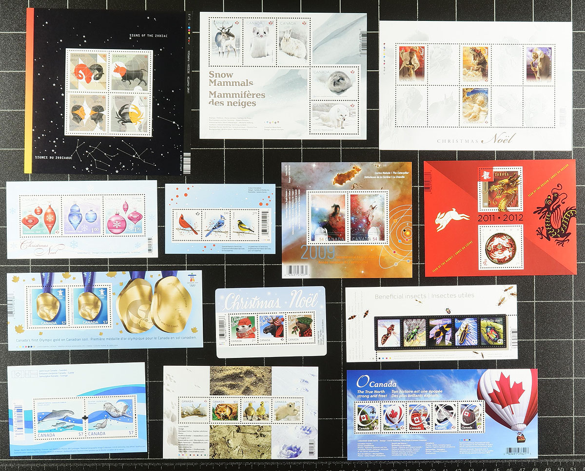 Modern Souvenir Sheets. An attractive holding of all-different modern souvenir sheets, including many "P" value stamps / mixed $1.00 PLUS values. A total of 40 sheets, including Superman, 2010 Olympics, Snow Mammals, Roadside Attractions, Joe Fafard etc. Conservatively value for the total face value alone (catalogue value would be at least double). Total face value =