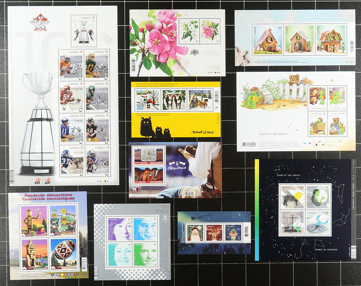 Modern Souvenir Sheets. A second offering of all-different (and all different from the first offering) modern souvenir sheets including many "P" and DOLLAR PLUS values. A total of 32 sheets, with issues for CFL, Remembrance Day, CAPEX, Lunar New Year, Maud Lewis, Gingerbread Houses etc. Conservatively value for the total face value alone (catalogue value would be at least double). Total face value =