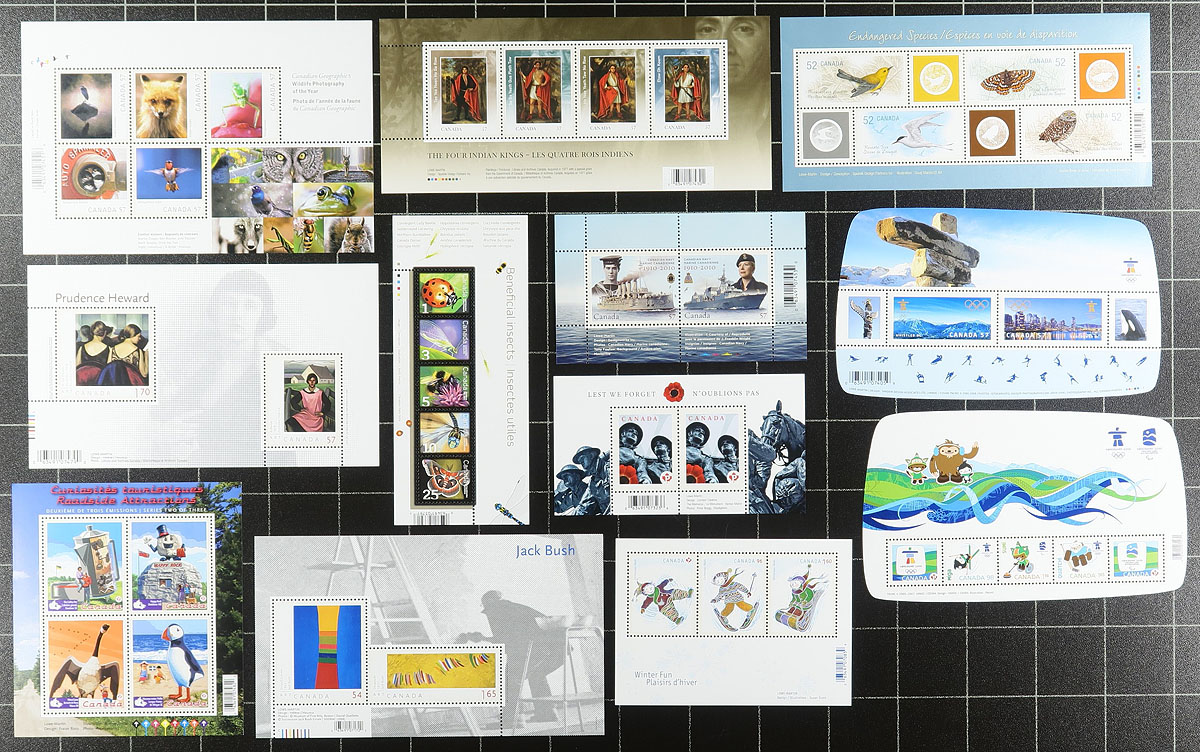 Modern Souvenir Sheets. A second offering of all-different (and all different from the first offering) modern souvenir sheets including many "P" and DOLLAR PLUS values. A total of 32 sheets, with issues for CFL, Remembrance Day, CAPEX, Lunar New Year, Maud Lewis, Gingerbread Houses etc. Conservatively value for the total face value alone (catalogue value would be at least double). Total face value =