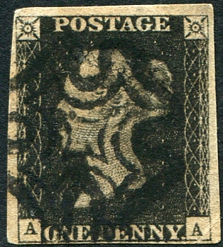 Four-margin used "Penny Black" position "A-A" with a "socked on the nose" black "Maltese Cross". A wonderfully sharp example of the world's best known stamp. Pressed out horizonal crease on the extreme LL corner, but still a nice example of the world's best known stamp. 2025 Scott US$375.00 =