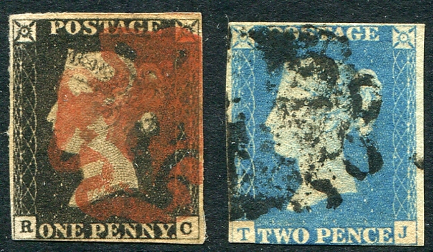 Fine used examples of the world's first two stamps, the Penny Black and the Two Penny Blue. Margins tight to just touching. Unchecked for plates. A good start to any GB or worldwide collection! 2025 Scott US$1,050.00 =