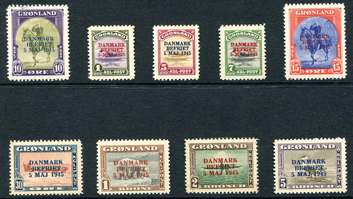 Complete mint Lightly Hinged 1945 issue pictorial set of nine, all with commemorative overprints in carmine or blue commemorating the liberation of Denmark from the Germans. A scarce and popular WWII thematic set. 2026 Scott US$607.50 =
